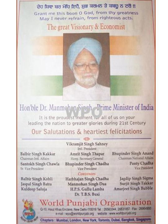 News Letter – May 2004 From: Sr. Vikramjit Singh Sahney, (President) The Hindustan Times: May 2004 WPO printed this advertisement in the leading newspaper to felicitate Hon’ble Dr. Manmohan Singh, The Prime Minister of India.